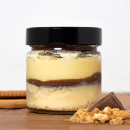 Deliciosa crema pastelera con arena de galleta y cobertura de chocolate con leche.